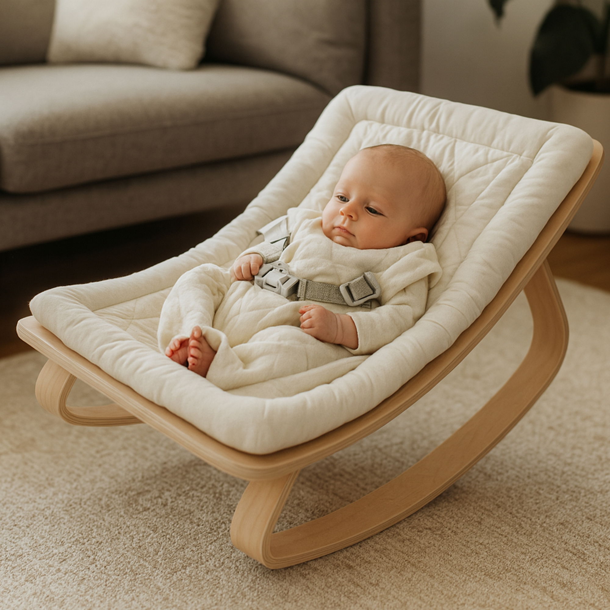 Babywippe Holz natur mit 5 cm starker, abnehmbarer Baumwollauflage