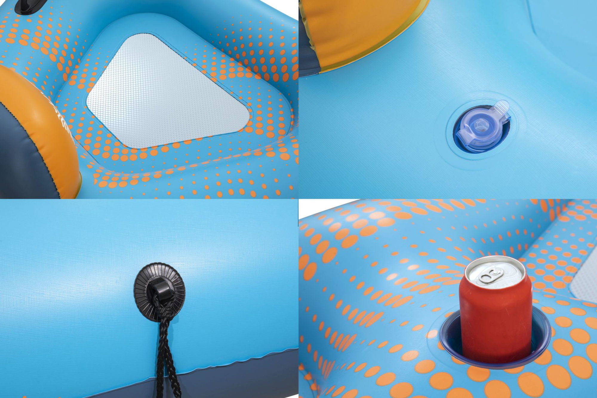 ## Einfache Handhabung und flexible Nutzung Die Bestway Badeinsel Day Drifter lässt sich mit einer geeigneten Luftpumpe (nicht im Lieferumfang enthalten) schnell aufpumpen. Praktische Schnellverschlussventile erleichtern das Befüllen und Entlüften der Luftkammern, sodass die Insel nach Gebrauch im Handumdrehen wieder platzsparend verstaut werden kann. Zwei Clasp N Go Schnallen ermöglichen es, zwei Badeinseln miteinander zu verbinden – ideal, wenn mehrere Gruppen gemeinsam auf dem Wasser entspannen möchten. Die Badeinsel eignet sich für den Einsatz auf ruhigen Seen, in Badebuchten oder in ausreichend großen Pools und bietet überall eine auffällige und komfortable Relax-Plattform.