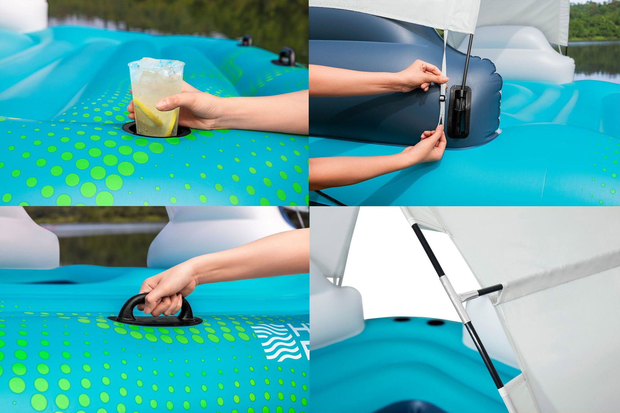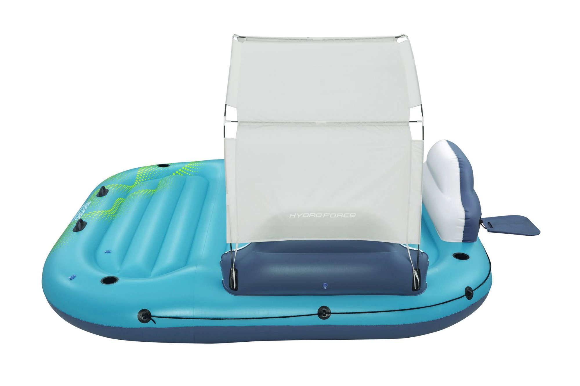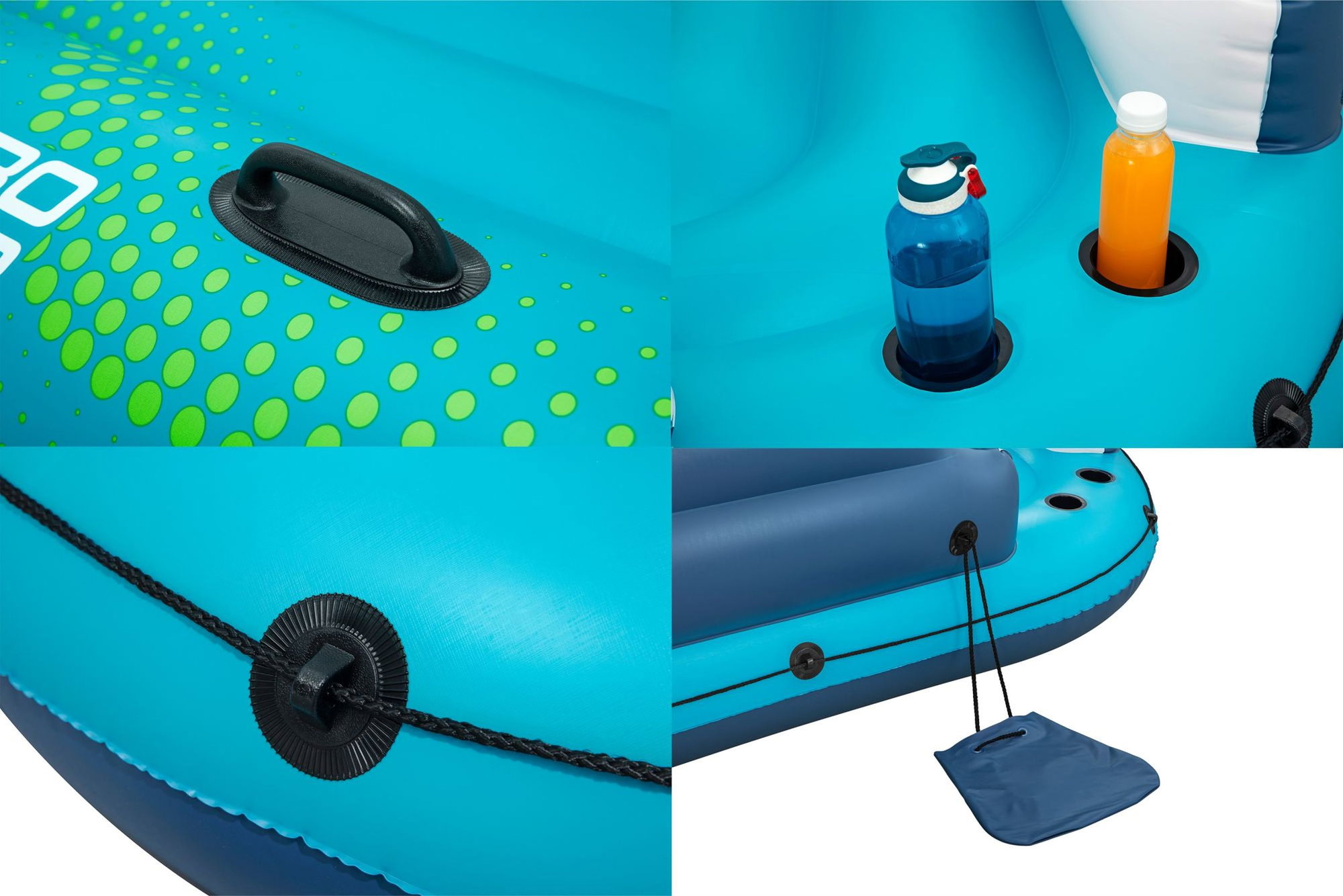 - Ausstattung: abnehmbares Sonnenschutzdach, 3 aufblasbare Rückenlehnen, 5 Getränkehalter, robuste Haltegriffe, halbumlaufende Halteleine, Schnellverschlussventile, Ankertasche, Reparaturflicken