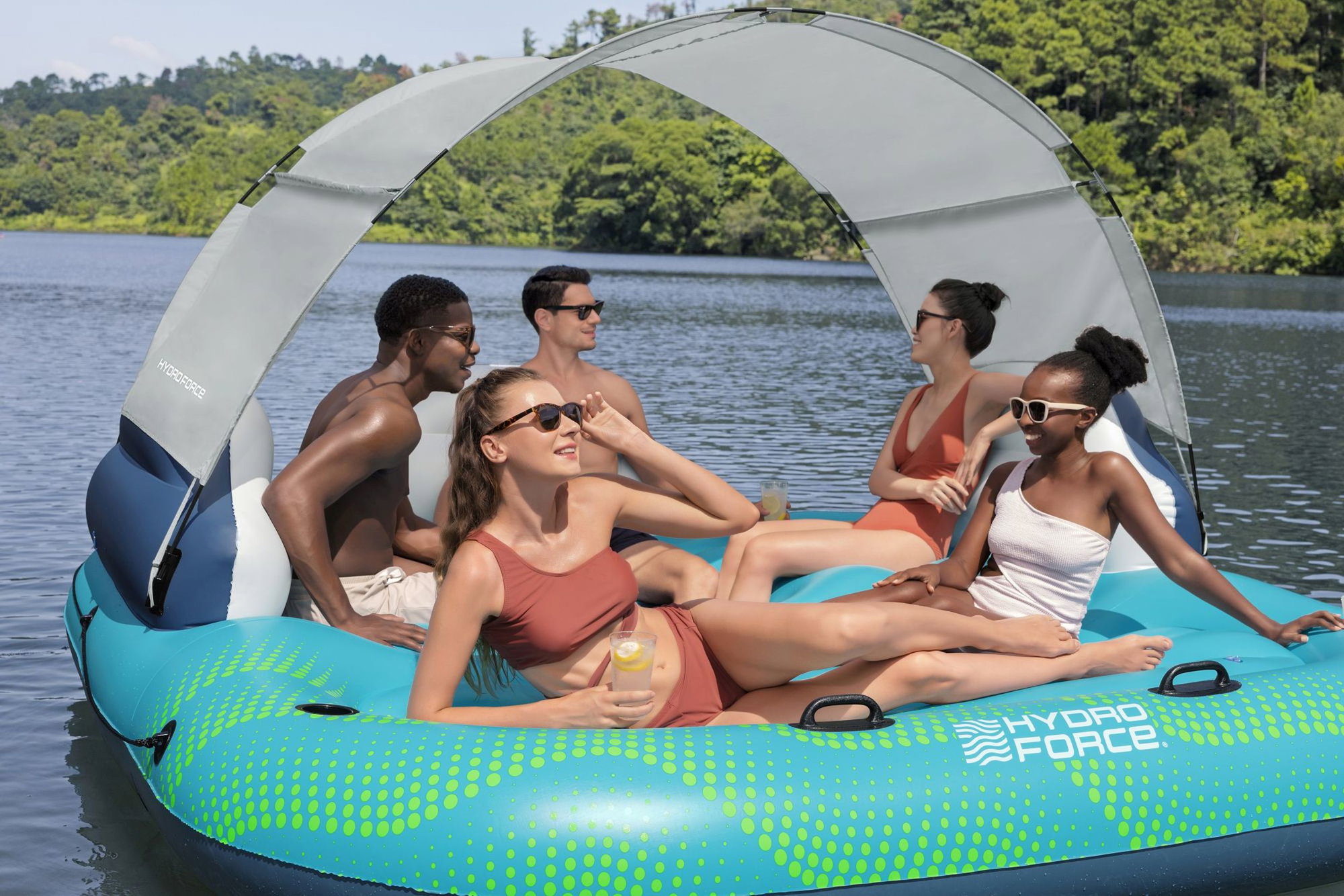 - Hydro Force 5-Personen-Badeinsel Sonnenlounge mit unaufgeblasener Größe 300 x 275 cm