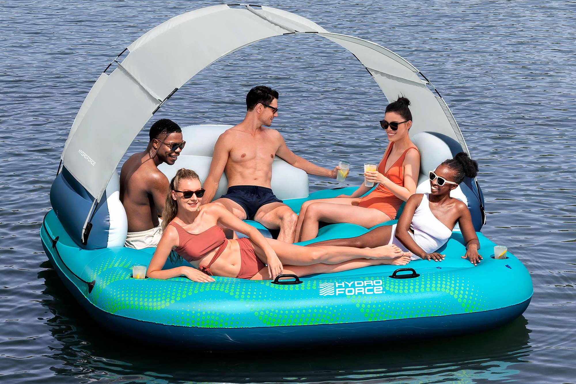 Die Bestway Hydro Force 5-Personen-Badeinsel Sonnenlounge 280 x 257 x 81 bietet Ihnen eine großzügige Relax-Zone auf See oder im großen Pool. Dank strapazierfähigem PVC mit Color Shield Beschichtung, abnehmbarem Sonnendach, drei Rückenlehnen, Getränkehaltern und halbumlaufender Halteleine genießen bis zu fünf Personen entspannte Stunden auf dem Wasser.