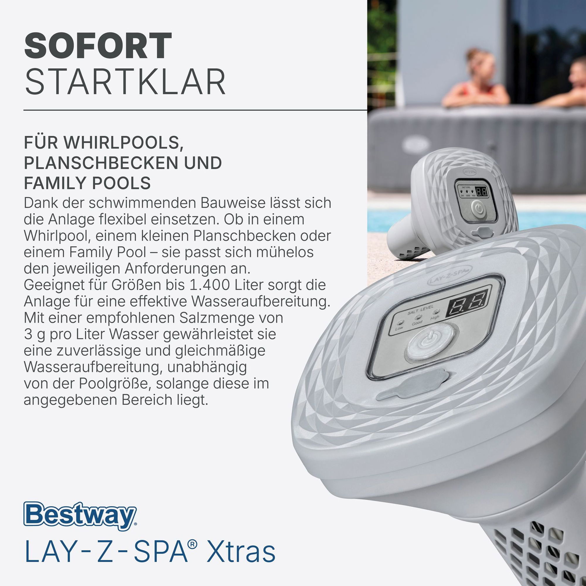 - Benötigte Start-Salzmenge: 3 g/l (direkt in den Pool oder Whirlpool geben)