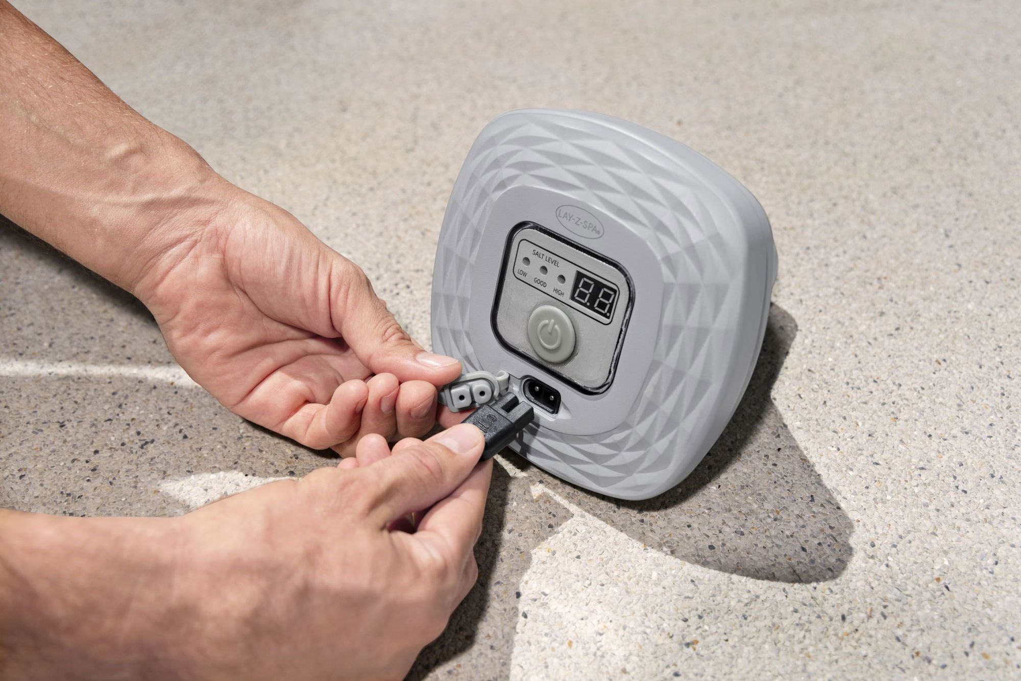 ## Salzwasseranlage Whirlpool Hydrogenic 0,5 g/h – komfortable Wasserpflege Die Salzwasseranlage Whirlpool Hydrogenic 0,5 g/h von Bestway Lay-Z-Spa Xtras wurde speziell für Whirlpools und kompakte Pools entwickelt, in denen Sie möglichst entspannt kristallklares Wasser genießen möchten. Statt regelmäßig herkömmliches Chlor zu dosieren, geben Sie eine definierte Menge Salz in das Becken. Die schwimmende, akkubetriebene Einheit wandelt dieses Salz elektrolytisch in Chlor um und hält so das Wasser effizient sauber.