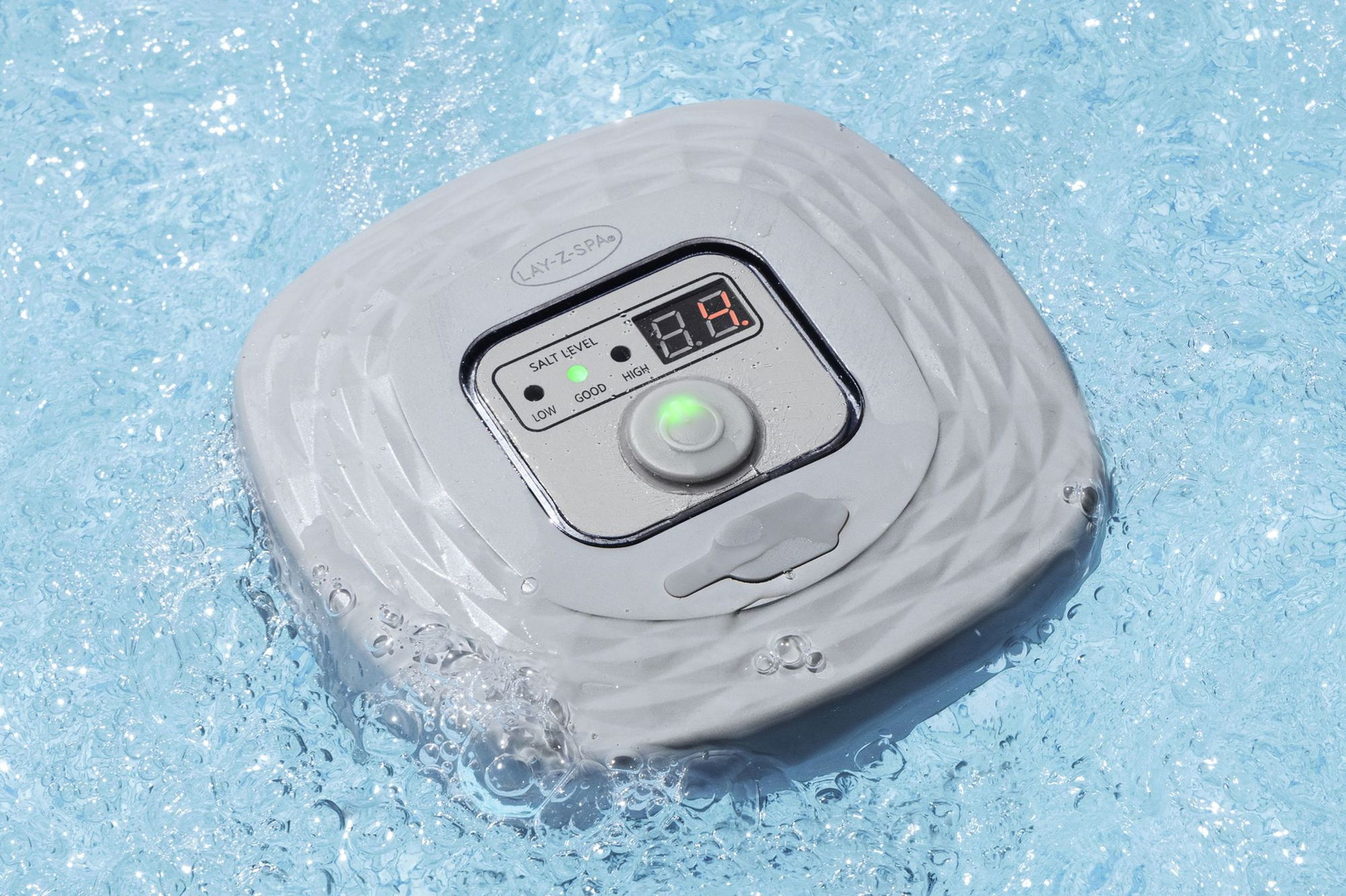 - Schwimmende, akkubetriebene Salzwasseranlage für Whirlpools und Pools bis 1.400 Liter Wasservolumen.