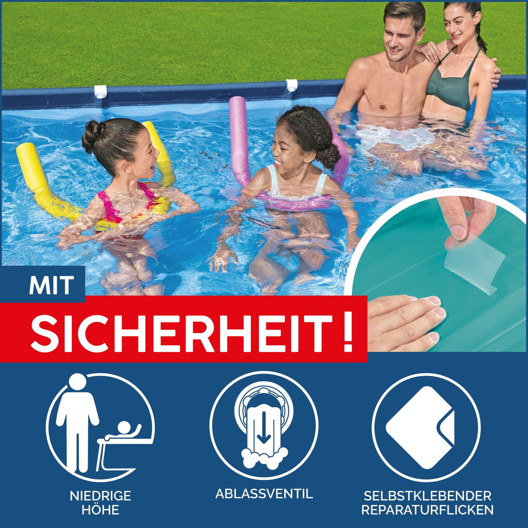 ### Welche Ausstattung ist im Lieferumfang enthalten? Im Lieferumfang enthalten sind der Pool mit Stahlrahmen und TriTech-Poolfolie, die Flowclear Filterpumpe mit passender Filterkartusche sowie ein selbstklebender Reparaturflicken. Der Reparaturflicken kann bei kleineren Beschädigungen der Folie eingesetzt werden und hilft, die Nutzungsdauer des Pools zu verlängern.