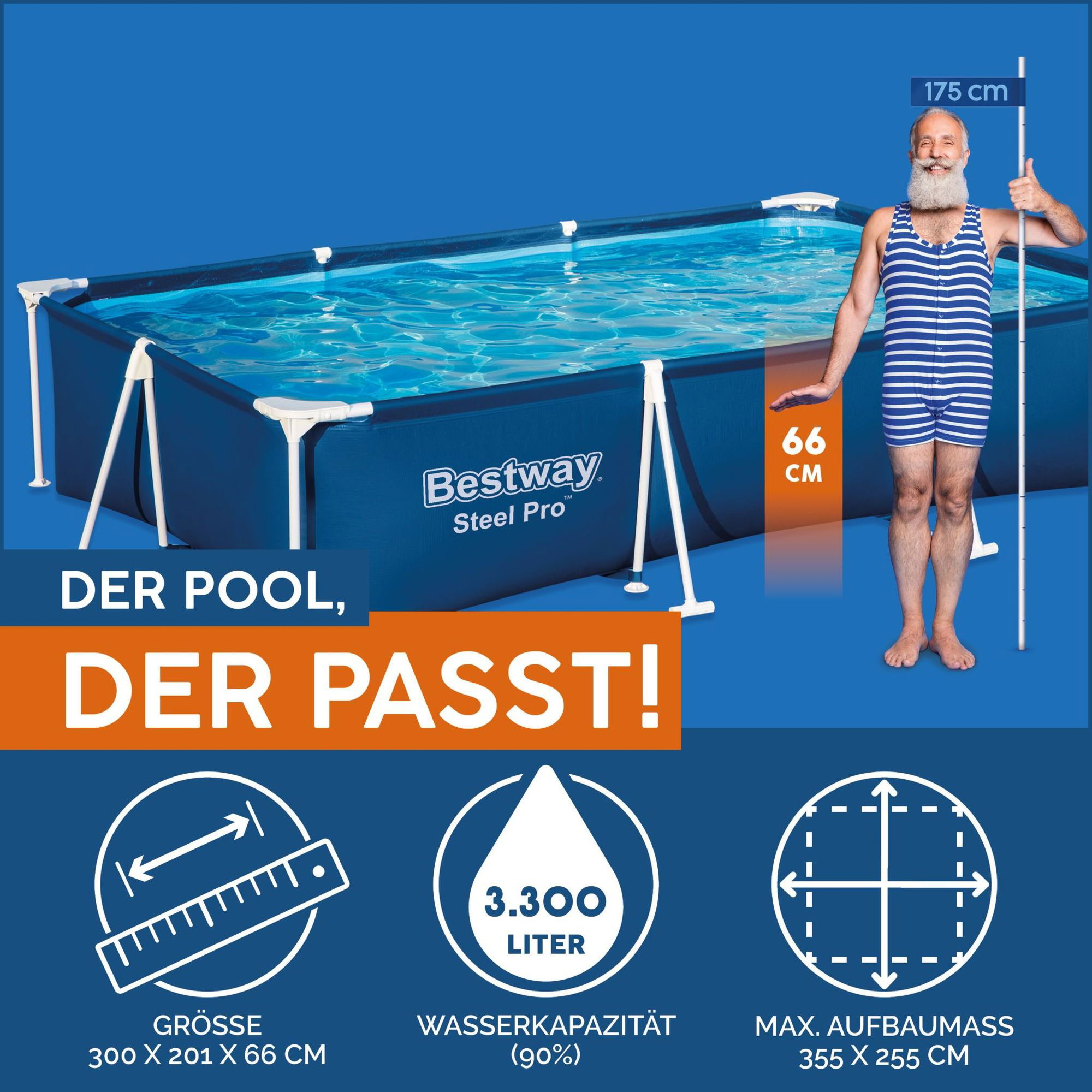 - **Rechteckiger Familienpool:** Steel Pro Frame Pool Komplett-Set 300 x 201 x 66 cm mit ca. 3.300 l Wasserkapazität (bei 90 % Füllung).