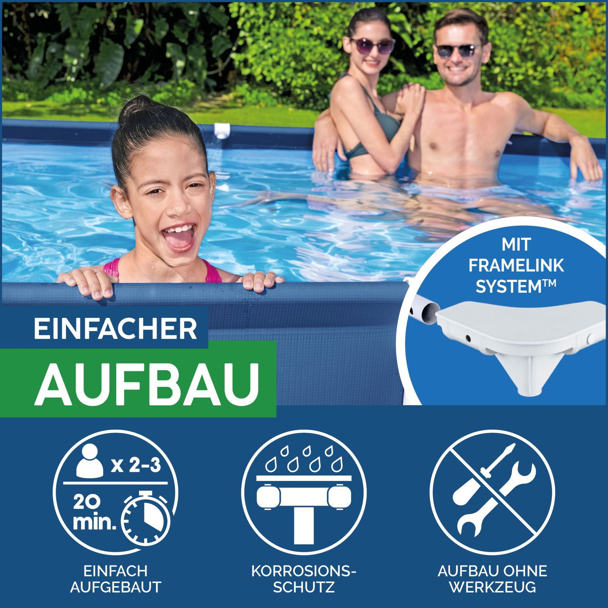 - **Inklusive Filterpumpe:** Flowclear Filterpumpe #58381 (1.249 l/h, 220–240 V, 12-V-Trafo, 23 W, Schutzklasse II, geeignet für DE / NL / BE / LU) mit Filterkartusche #58093 (Größe I).