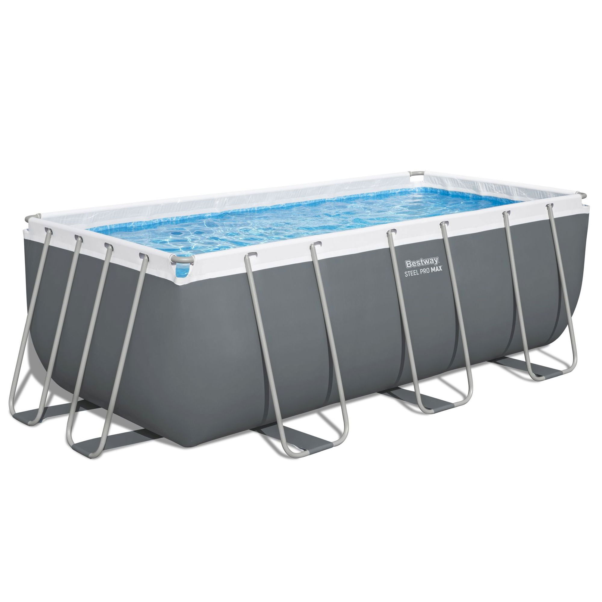 - **Rechteckiger Familienpool:** Steel Pro MAX Frame Pool mit 412 x 201 x 122 cm und ca. 8.124 l Wasserkapazität (bei 90 % Füllung).