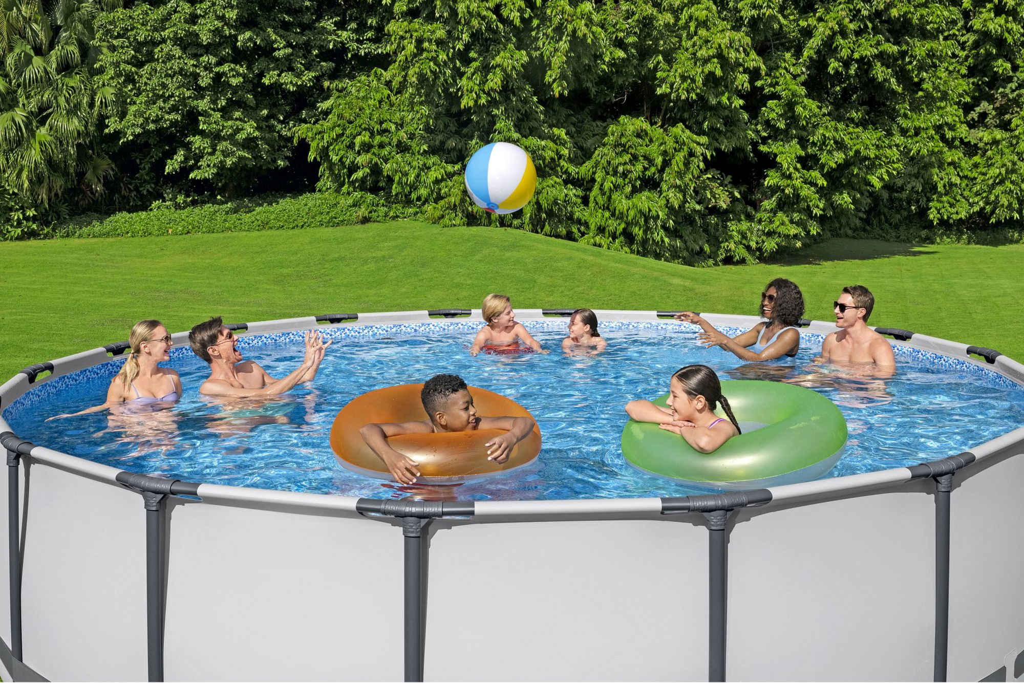 ## Freundliches Design in lichtgrau mit Kieselmosaik-Optik Außen präsentiert sich der Pool in einem modernen Lichtgrau, das sich harmonisch in viele Gartenumgebungen einfügt. Im Inneren sorgt die Verkleidung in Kieselmosaik-Optik für eine freundliche, lichtreflektierende Poolwirkung, sobald der Pool mit Wasser gefüllt ist. Durch die Kombination aus neutraler Außenfarbe und Mosaik-Optik innen wird der Bestway Steel Pro MAX Frame Pool zu einem dekorativen Blickfang im Garten.