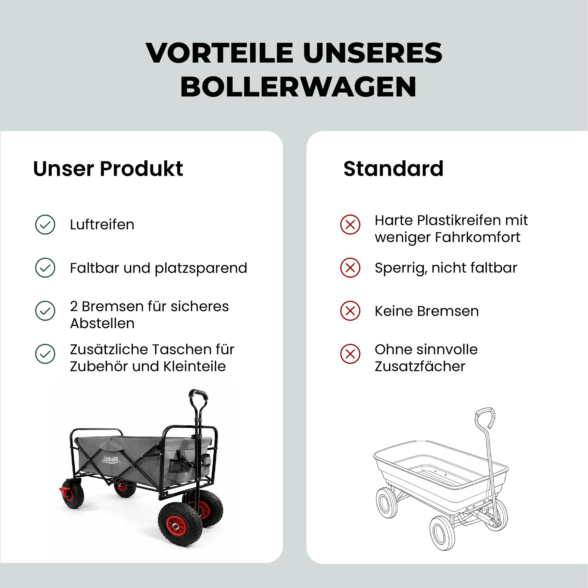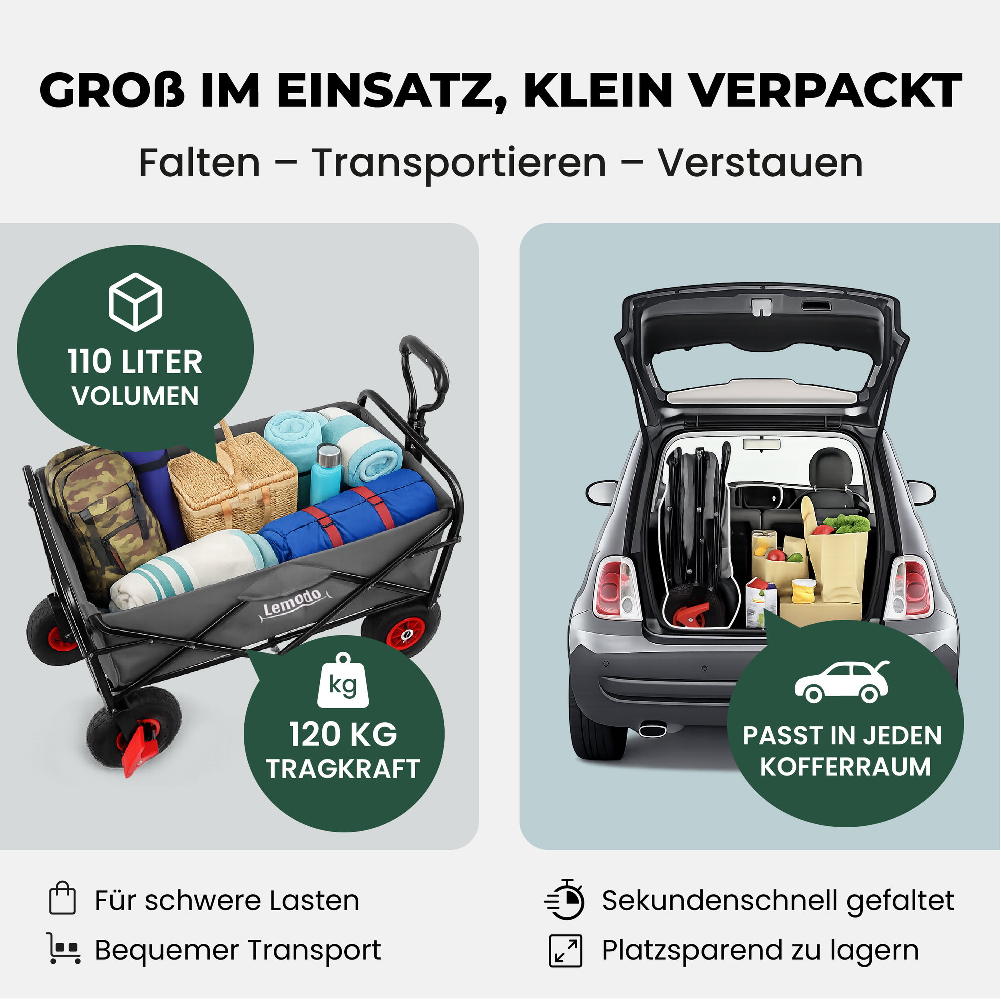 - PLATZSPAREND ZUSAMMENGEKLAPPT VERSTAUBAR: Unser faltbarer Bollerwagen lässt sich mit nur wenigen Handgriffen kompakt zusammenfalten. So kann der Faltbollerwagen platzsparend transportiert und gelagert werden