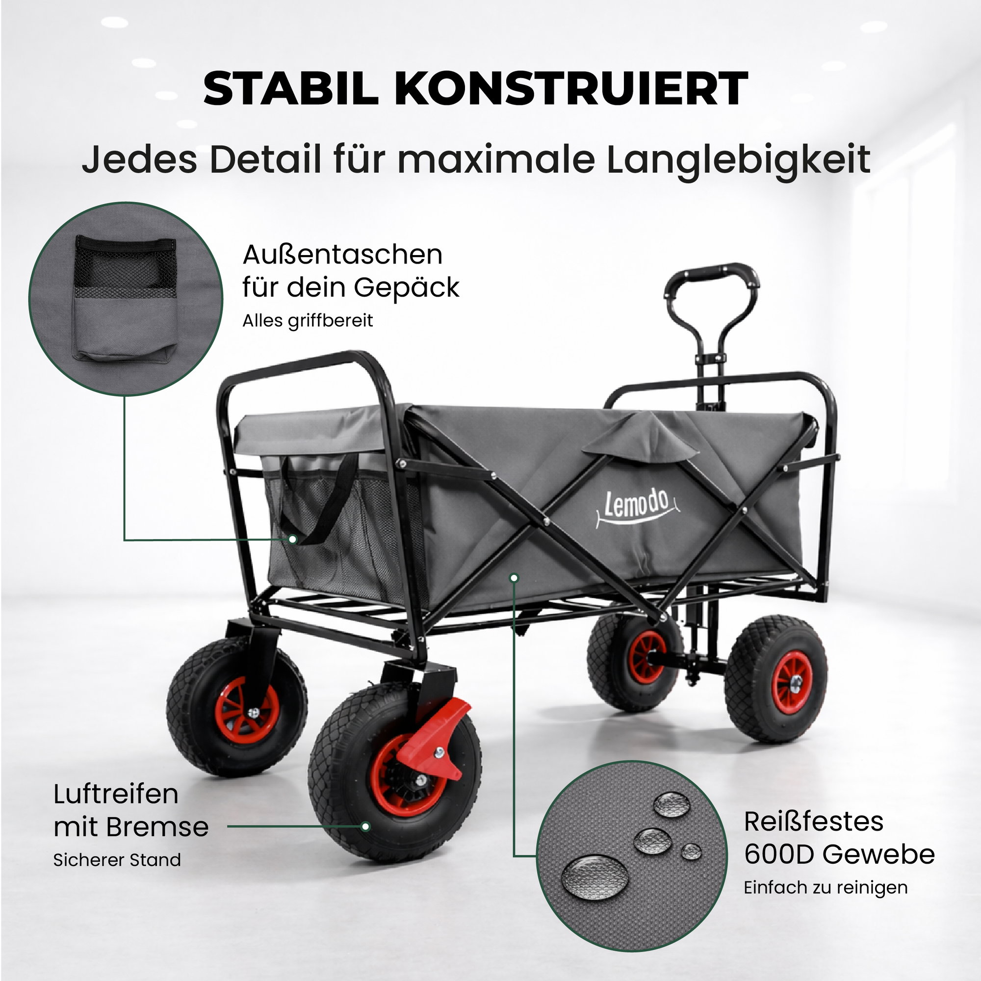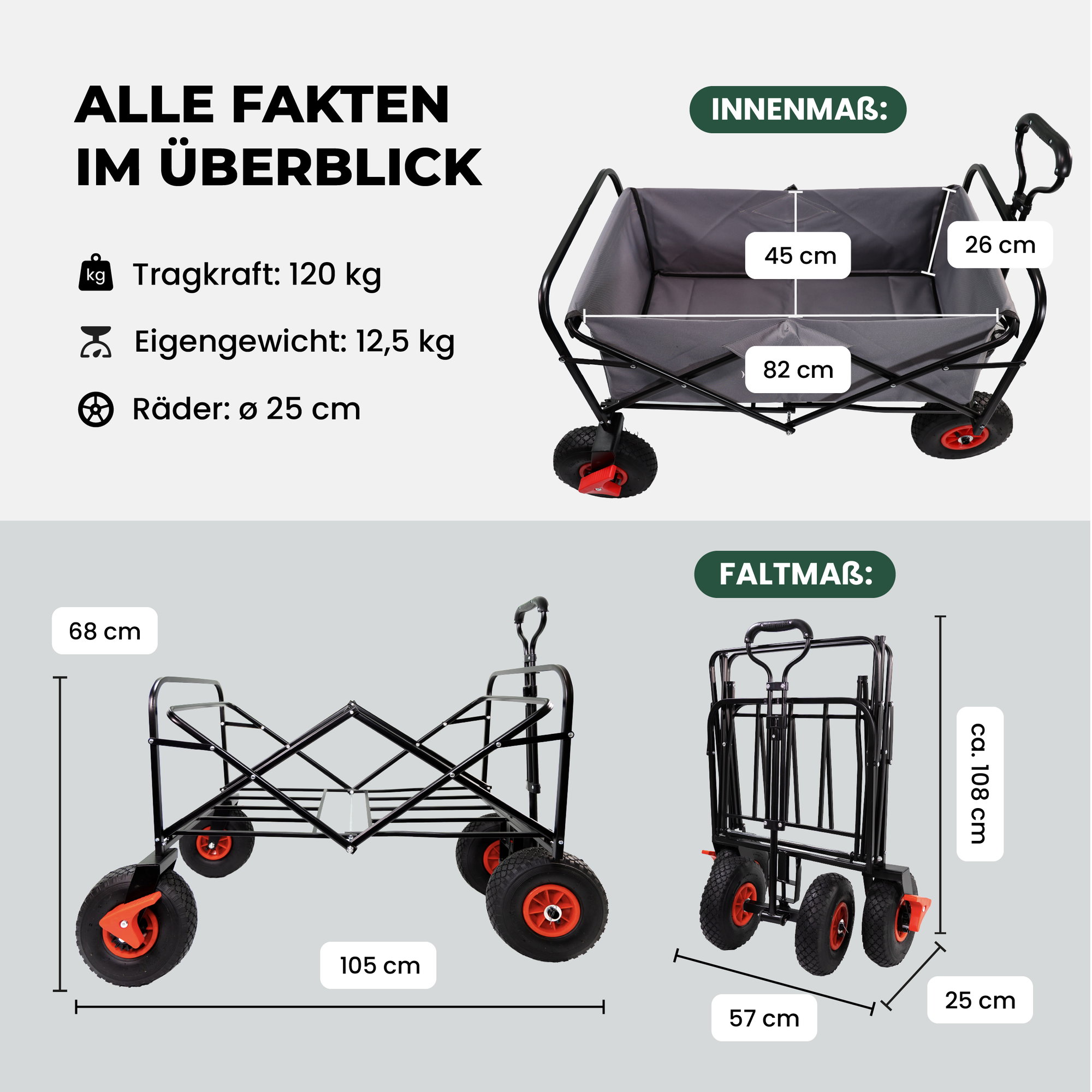 Produktinformationen "Bollerwagen faltbar, grau, Handwagen mit 120 kg Zuladung, Leiterwagen mit Luftreifen"