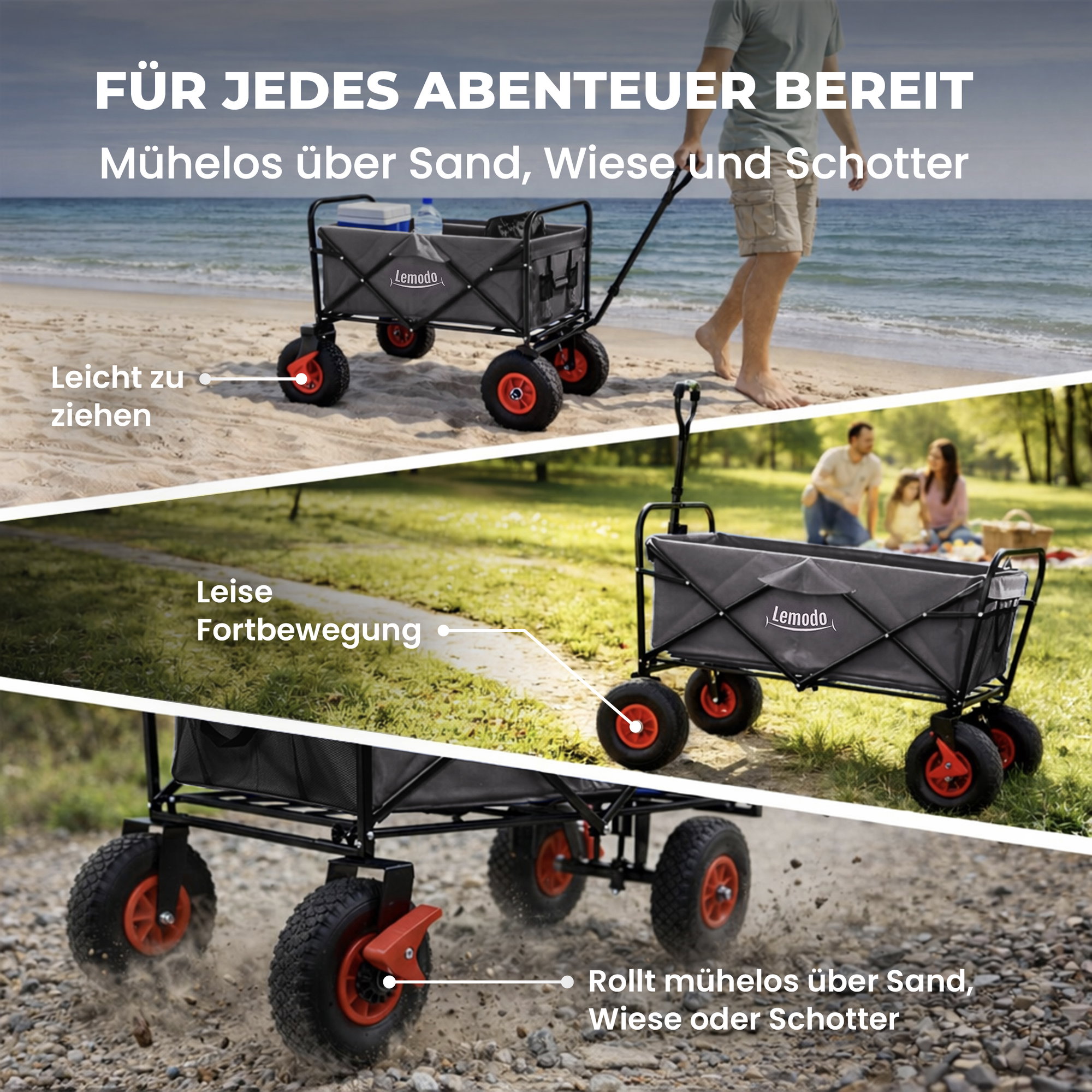 Der Bollerwagen besticht durch seine zahlreichen kleinen Taschen, die eine perfekte Organisation des Gepäcks ermöglichen. Er ist der ideale Begleiter für viele Gelegenheiten: Ob beim Camping, auf der Grillparty, beim Einkaufen im Einkaufszentrum oder beim Wandern im Park – der Bollerwagen bietet ordentlich Platz und ist für alle Outdoor-Aktivitäten bestens geeignet. Er macht Ausflüge mit den Kindern, Besuche auf Festivals und andere Freizeitaktivitäten komfortabler und organisierter.