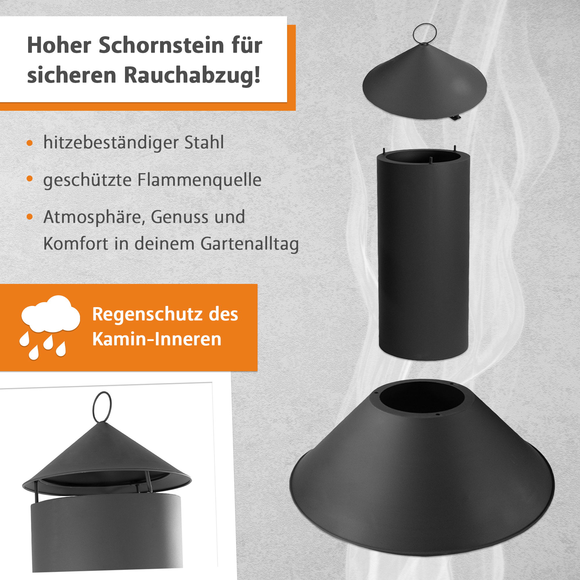 - Hoher Schornstein für sicheren Rauchabzug mit Regenschutz