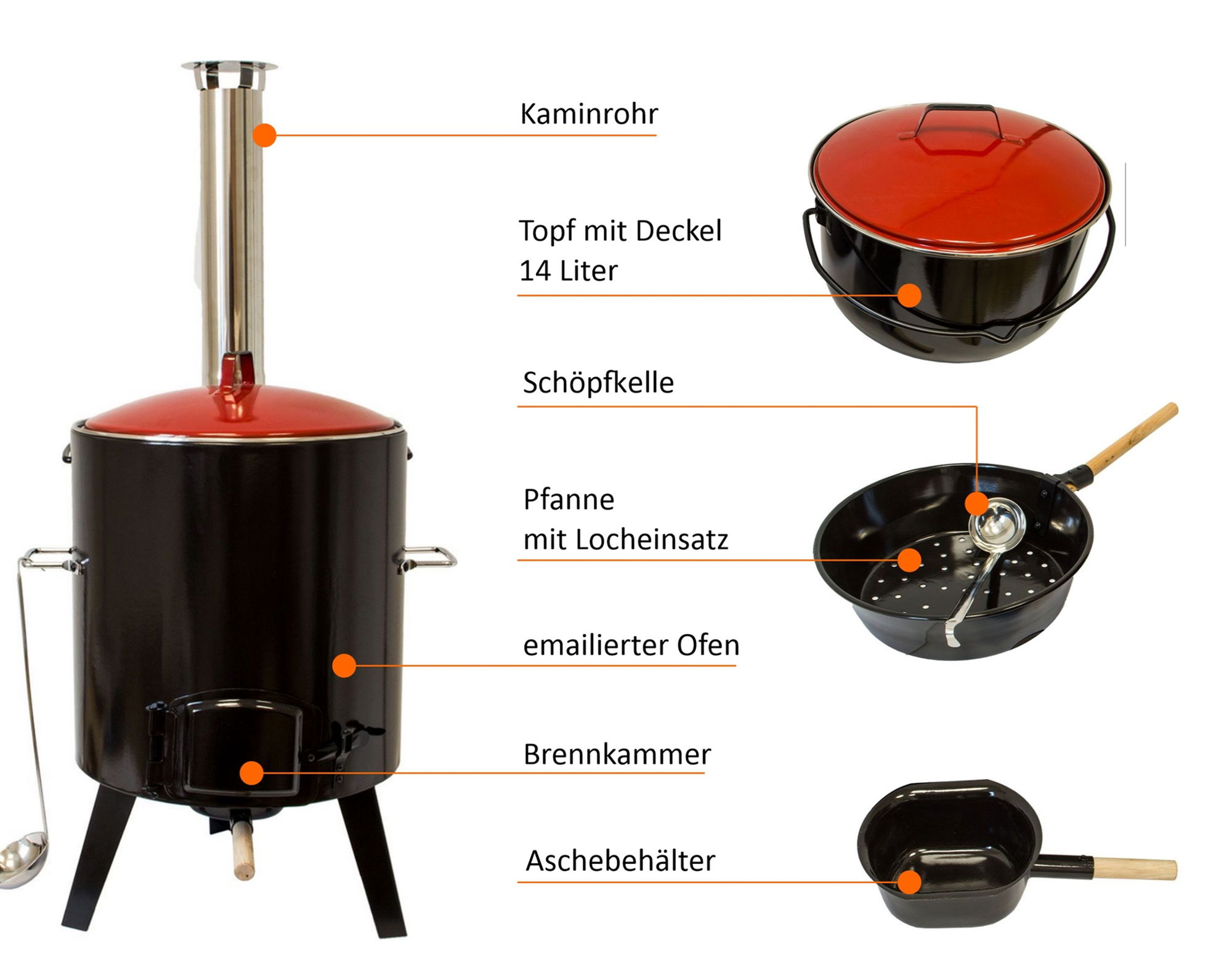 Produktinformationen "Gulaschkanone mit Kesseltopf, Pfanne und Suppenkelle, Raketenofen"