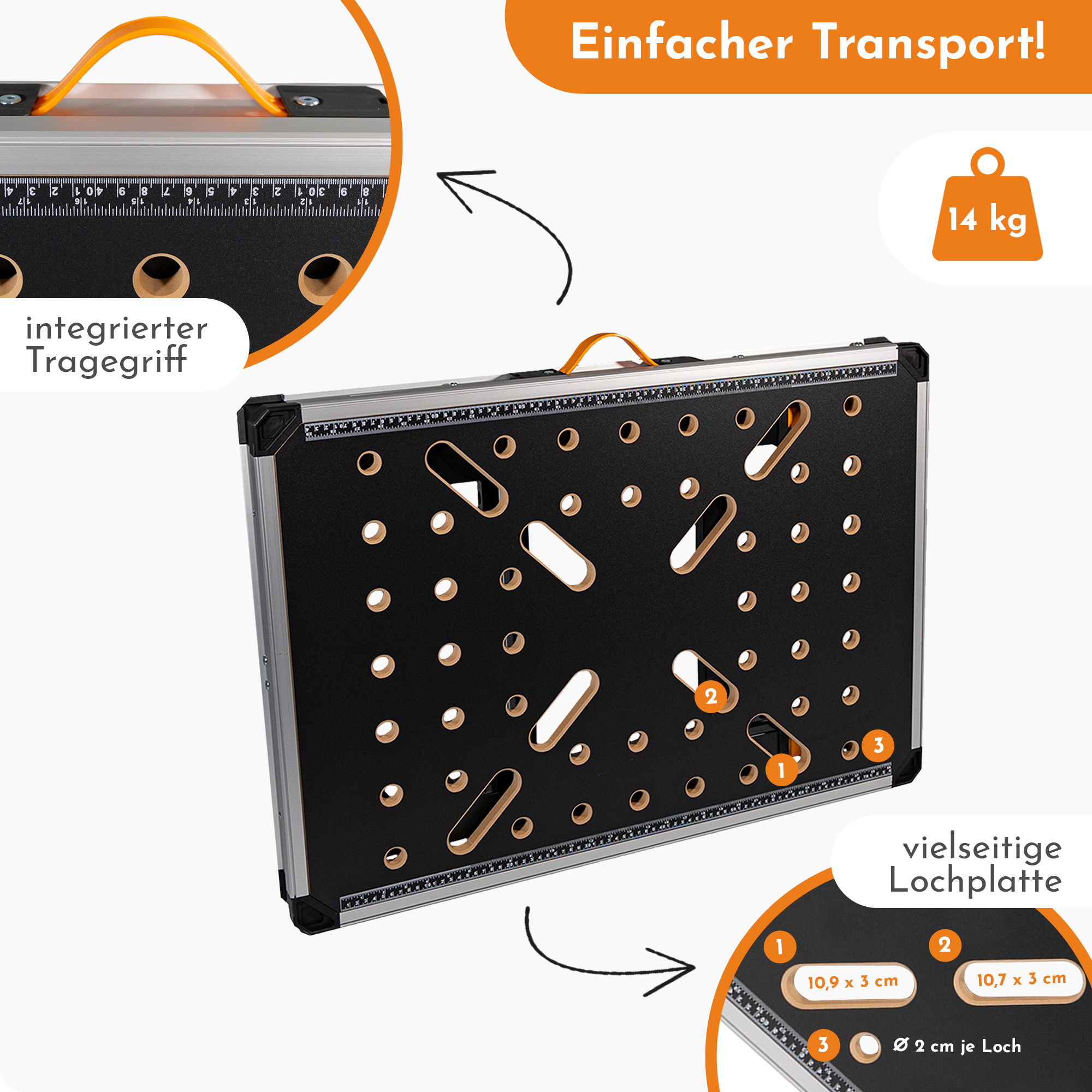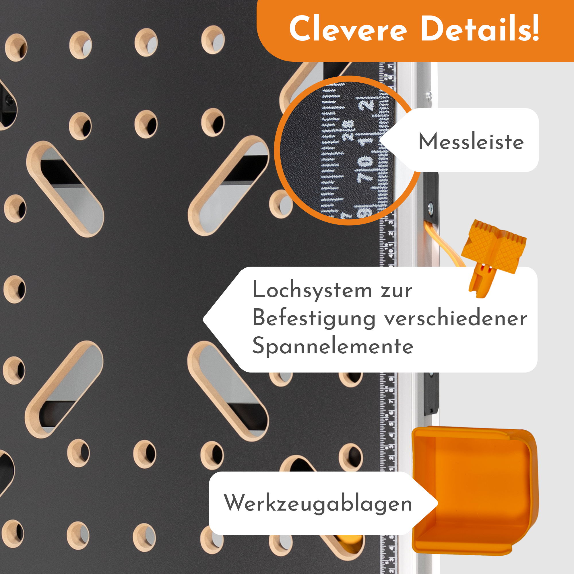 - CLEVERE DETAILS: Werkzeughalterungen in den Querstreben der Tischbeine schaffen Platz auf dem Montagetisch. Gummifüße stabilisieren den Werkzeugtisch und schonen gleichzeitig Deinen Boden. Die aufgedruckten Messleisten ersetzen den Meterstab