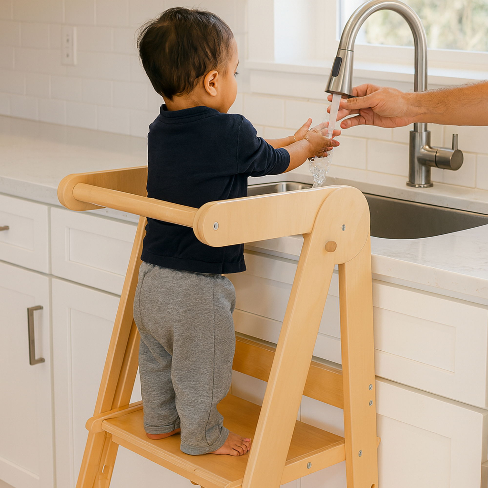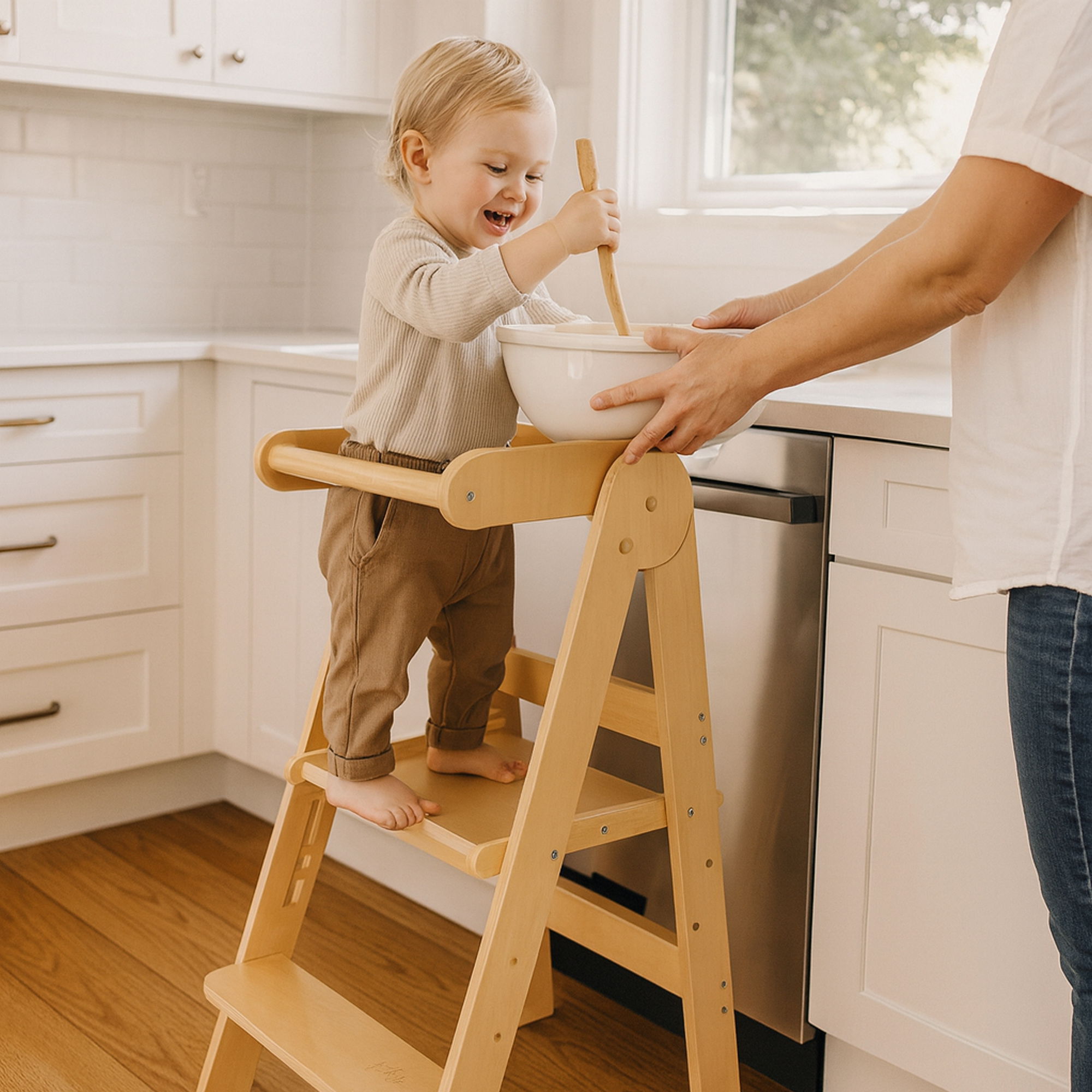 Der Lernturm besteht aus Birkenholz bzw. Birken-Sperrholz in natur lackierter Ausführung. Die glatten, lackierten Oberflächen lassen sich im Alltag schnell mit einem feuchten Tuch reinigen – ideal, wenn beim Backen mal Mehl staubt oder beim Basteln Farbe tropft. Gleichzeitig fügt sich die natürliche Holzoptik harmonisch in moderne Küchen, Bäder oder Kinderzimmer ein. Ob beim Zähneputzen am Waschbecken, beim Gemüse schnippeln in der Küche oder beim kreativen Gestalten am Basteltisch: Der Montessori Lernturm unterstützt dein Kind dabei, aktiv teilzunehmen und neue Fähigkeiten zu entdecken. So wird aus einem einfachen Möbelstück ein täglicher Helfer, der Nähe, Vertrauen und Selbstständigkeit stärkt.