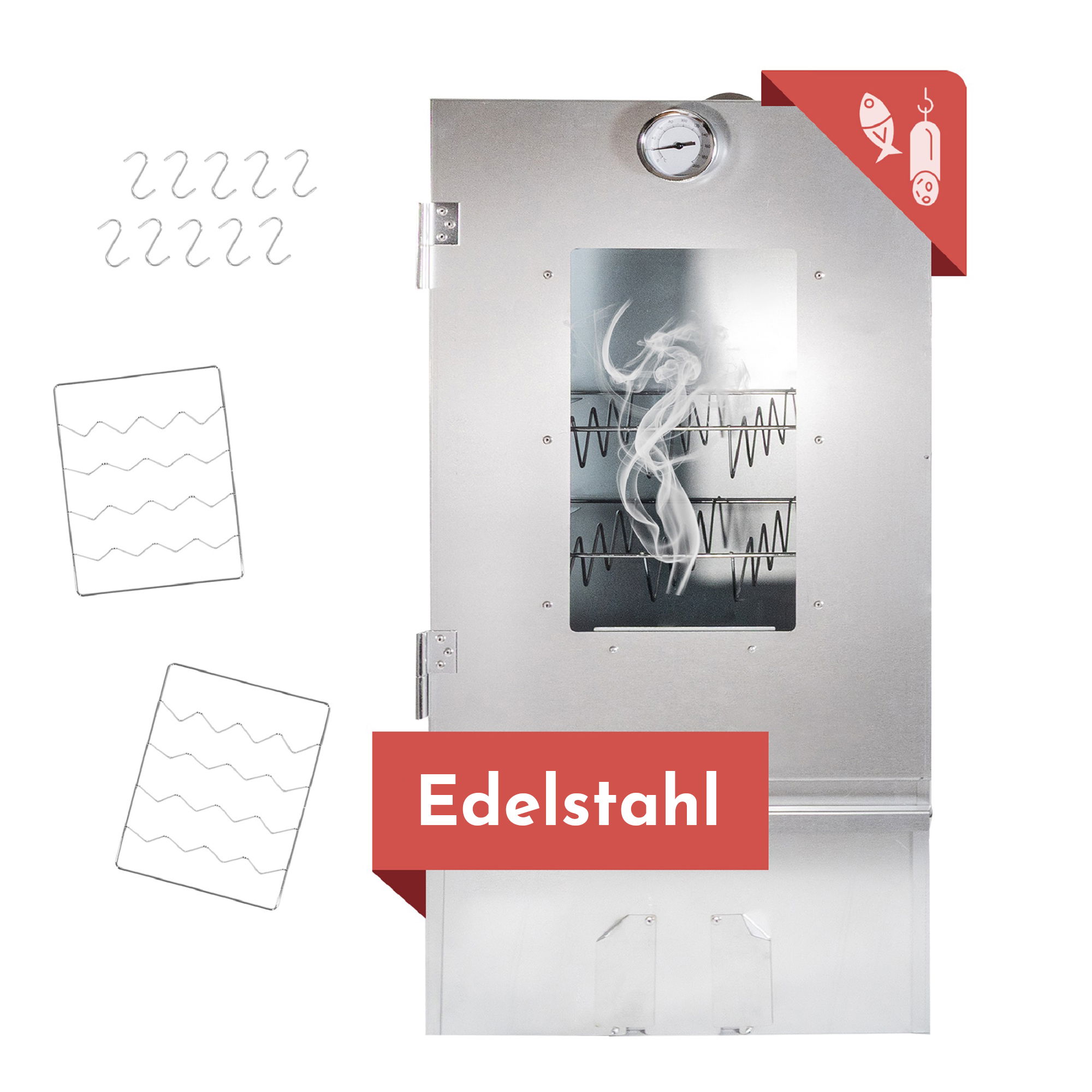Mit unserem hochwertigen Räucherofen aus Edelstahl genießt Du ein außergewöhnliches Geschmackserlebnis – ganz bequem bei Dir zu Hause. Ob aromatischer Fisch, zartes Fleisch, würzige Wurst oder feiner Käse: Du kannst Deine eigenen Räucherwaren herstellen und Deinen Gerichten eine besondere Note verleihen. Gleichzeitig eröffnen sich Dir völlig neue kulinarische Möglichkeiten, die weit über den Alltag hinausgehen. Der Räucherofen wird vormontiert geliefert und ist mit nur wenigen Handgriffen einsatzbereit. So kannst Du direkt loslegen, ohne lange Aufbauzeiten in Kauf nehmen zu müssen. Im Lieferumfang enthalten sind alles, was Du brauchst: ein Thermometer zur Temperaturkontrolle, zwei Fischkörbe, Fleischhaken, eine Räucherbox, eine Räuchermehlwanne, ein Glutkasten sowie eine praktische Abtropfwanne, die zuverlässig verhindert, dass Fett in die Glut tropft. Damit bist Du bestens ausgestattet für ein perfektes Räuchererlebnis. Dank seiner durchdachten Konstruktion ist der Räucherschrank vielseitig einsetzbar. Du kannst ihn sowohl zum Kalträuchern als auch zum Warm- oder Heißräuchern verwenden – ganz nach Deinen Vorlieben und je nachdem, welches Räuchergut Du zubereiten möchtest. Die große Räucherkammer bietet ausreichend Platz für Fisch, Fleisch, Wurst, Käse oder sogar Gemüse und sorgt für gleichmäßige Ergebnisse. Ein integriertes Sichtfenster ermöglicht Dir jederzeit den Blick ins Innere, ohne dass Du die Tür öffnen musst – so bleibt die Temperatur konstant und der Räuchervorgang optimal gesteuert. Der stabile Unterbau, der im Lieferumfang enthalten ist, sorgt für einen sicheren Stand und eine angenehme Arbeitshöhe. Dadurch hast Du jederzeit bequemen Zugriff auf das Räuchergut und kannst den gesamten Prozess komfortabel überwachen. Mit diesem Räucherofen holst Du Dir professionelle Räuchertechnik in den eigenen Garten – einfach, effizient und mit echtem Genuss.