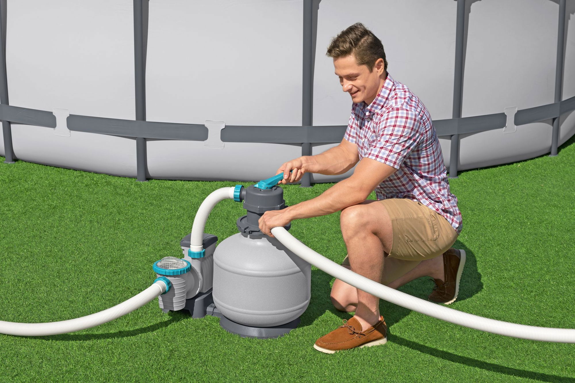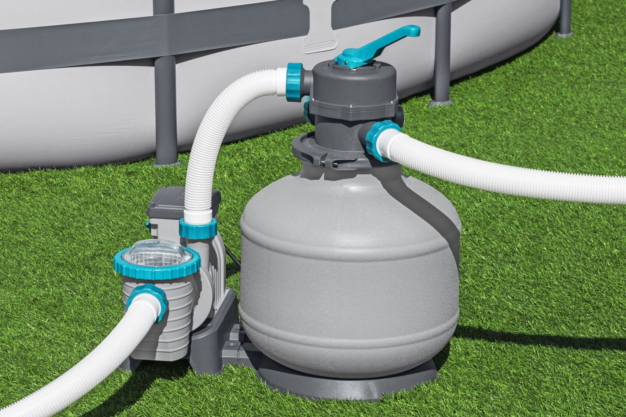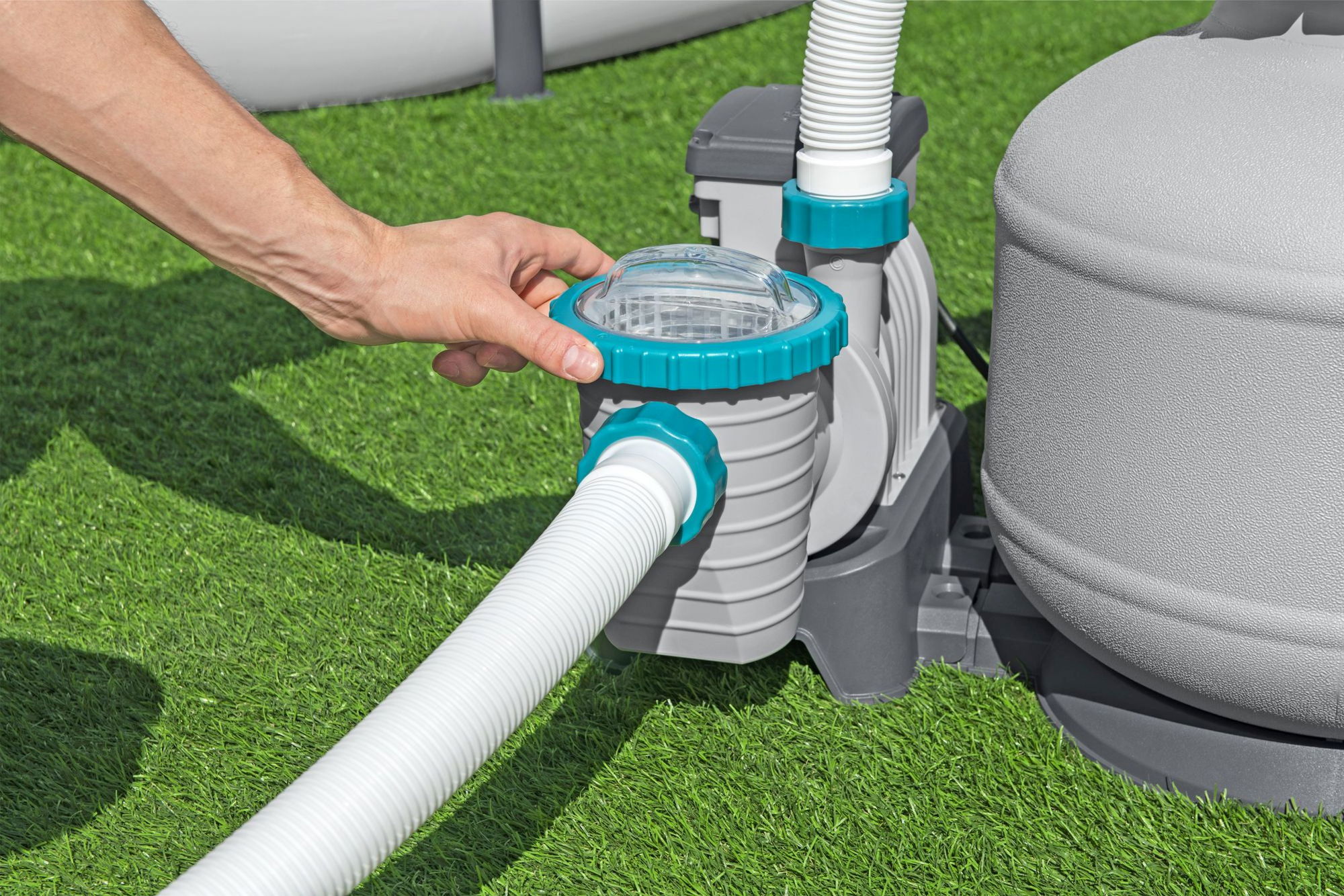 ### Zeitschaltuhr für komfortable Filtersteuerung Ein großes Plus dieser Sandfilteranlage ist die integrierte Zeitschaltuhr. Damit legen Sie bequem fest, wann und wie lange die Pumpe laufen soll. So können Sie die Filterzeiten an Ihre Badegewohnheiten, die Wasserbelastung und die Tageszeiten anpassen, ohne ständig manuell eingreifen zu müssen. Regelmäßige, automatisch gesteuerte Filterintervalle tragen dazu bei, Energie effizienter einzusetzen und gleichzeitig eine hohe Wasserqualität zu sichern. Sie behalten die Kontrolle über die Laufzeiten und können die Einstellungen bei Bedarf jederzeit anpassen.