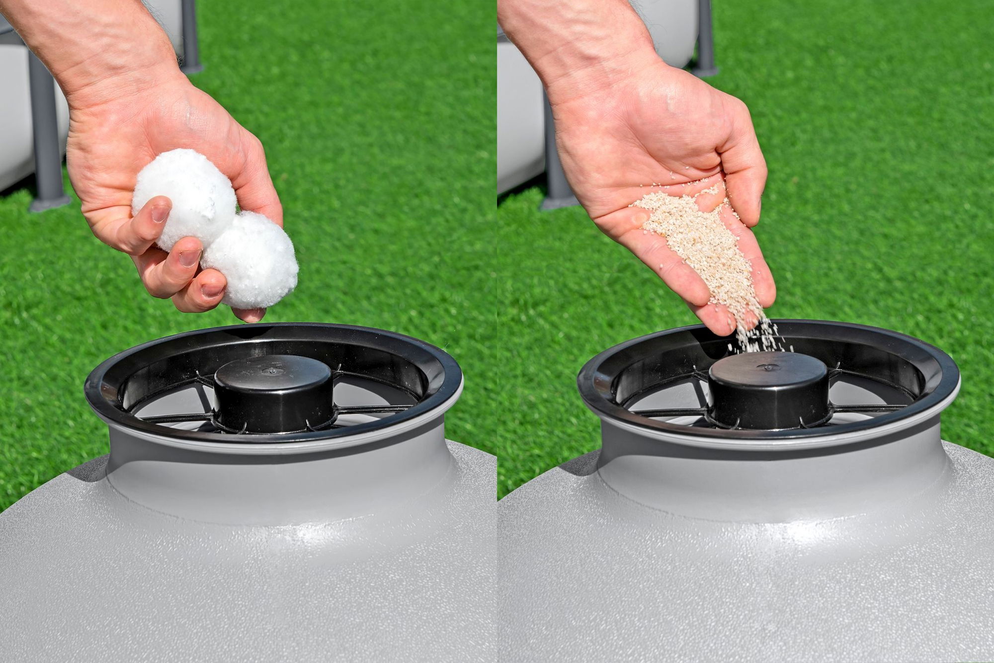 - **Wahl des Filtermediums:** Betrieb mit 36 kg Filtersand (Körnung 0,45–0,85 mm) oder Polysphere-Filterbällen #58475 (1.000 g).