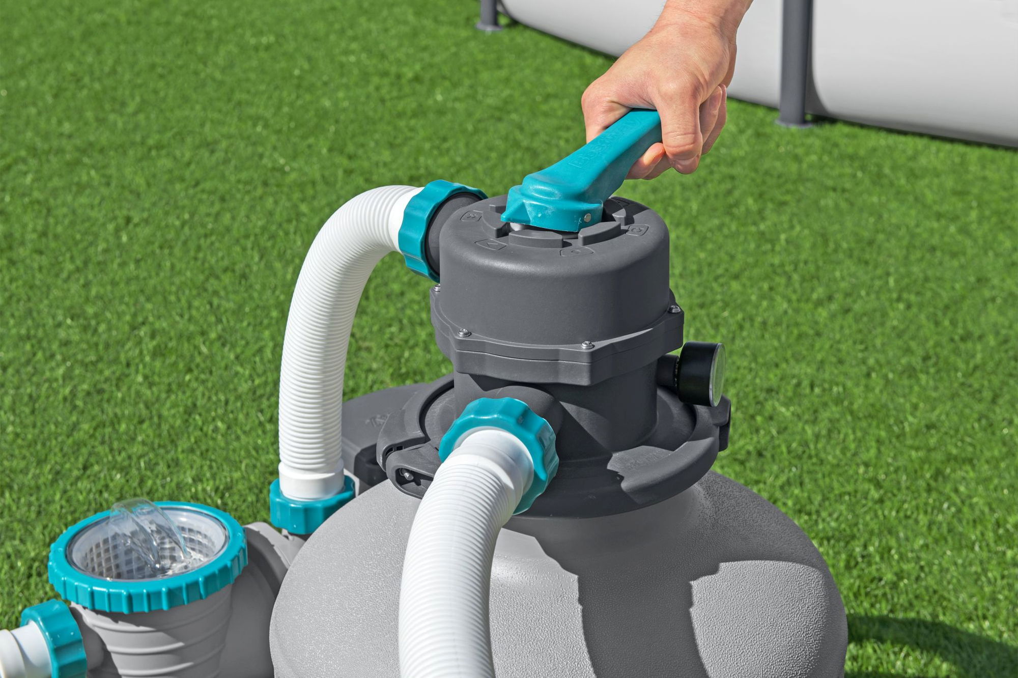 ### Wie funktioniert die Sandfilteranlage? Die Pumpe saugt das Wasser aus dem Pool an, leitet es durch das Filtermedium im Tank und führt es anschließend gereinigt zurück in den Pool. Schmutz, Blätter und feinere Partikel bleiben im Filterbett hängen. Über das 6-Wege-Ventil wählen Sie die gewünschte Funktion, zum Beispiel Filtern, Rückspülen, Nachspülen oder Entleeren. So kombinieren Sie gründliche Reinigung mit wenigen Handgriffen. Ein integrierter Vorfilter mit herausnehmbarem Sieb fängt grobe Verschmutzungen ab und schützt die Pumpe. Das gut ablesbare Manometer zeigt den Systemdruck an und hilft dabei, den richtigen Zeitpunkt für eine Rückspülung zu erkennen. Der robuste, korrosionsbeständige Filtertank mit 38,5 cm Durchmesser ist für den langfristigen Außeneinsatz ausgelegt.