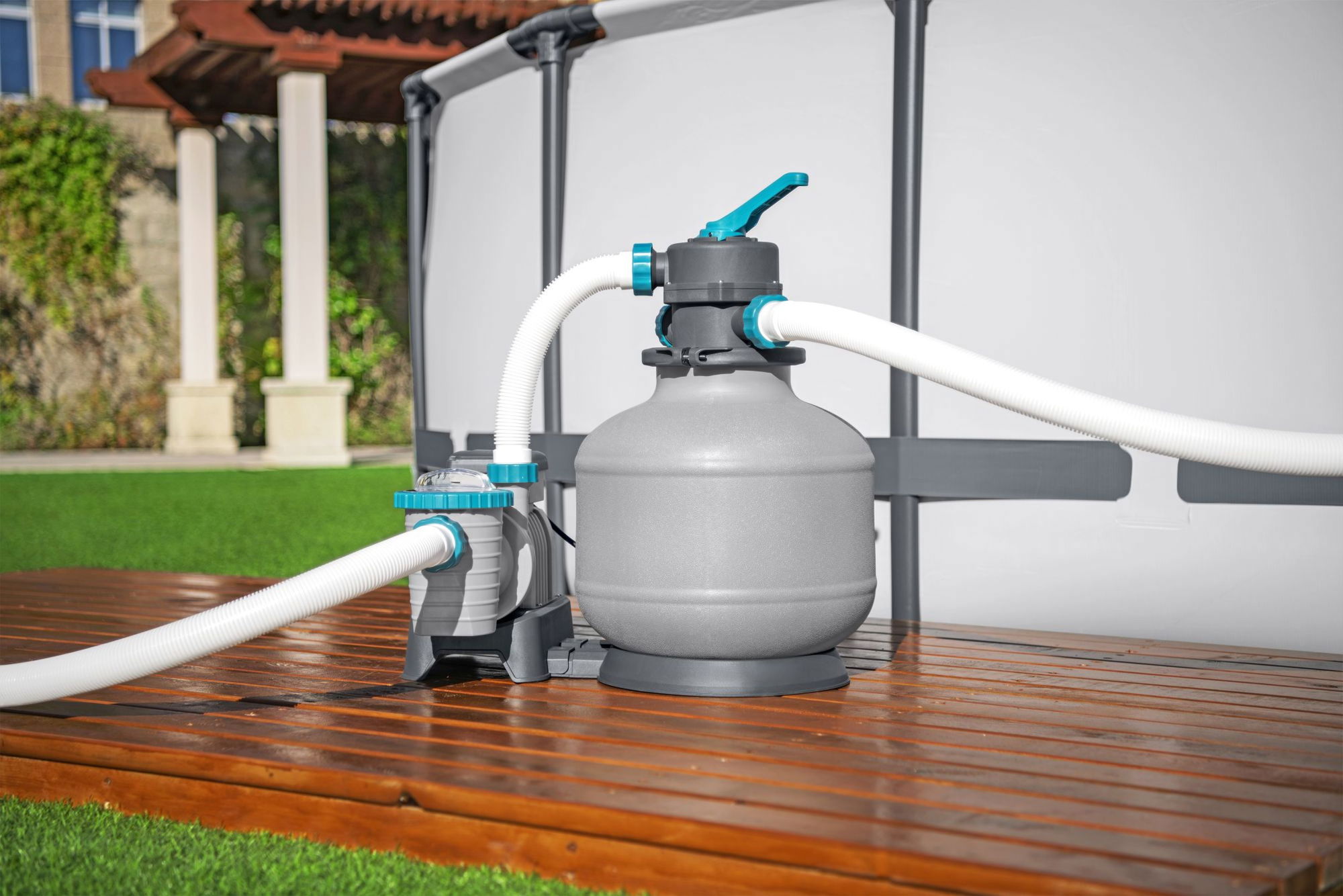 ### Sicherheit, Wartung und Pflege Für zusätzliche Sicherheit im Betrieb ist die Sandfilteranlage mit einem Personenschutzschalter ausgestattet. Dieser unterstützt den Schutz vor elektrischen Fehlern und erhöht die Betriebssicherheit der Pumpe. Die regelmäßige Rückspülung des Filtermediums sowie die Kontrolle und Reinigung des Vorfilters tragen dazu bei, die Leistung der Anlage langfristig zu erhalten. Dank der wartungsfreundlichen Konstruktion mit gut zugänglichen Anschlüssen, Vorfilter und Manometer lassen sich diese Arbeiten schnell erledigen. So bleibt Ihre Poolanlage über viele Saisons hinweg zuverlässig im Einsatz und sorgt für klares, einladendes Wasser.