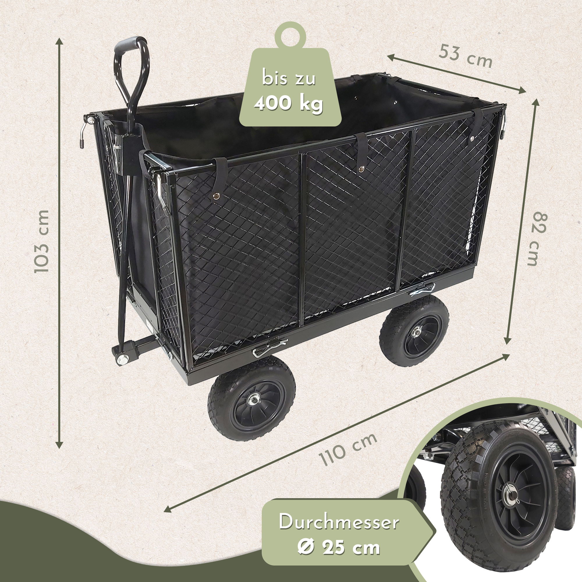 - 400 kg Tragkraft für schwere Lasten – ideal für Erde, Steine, Holz, Pflanzen und Werkzeug