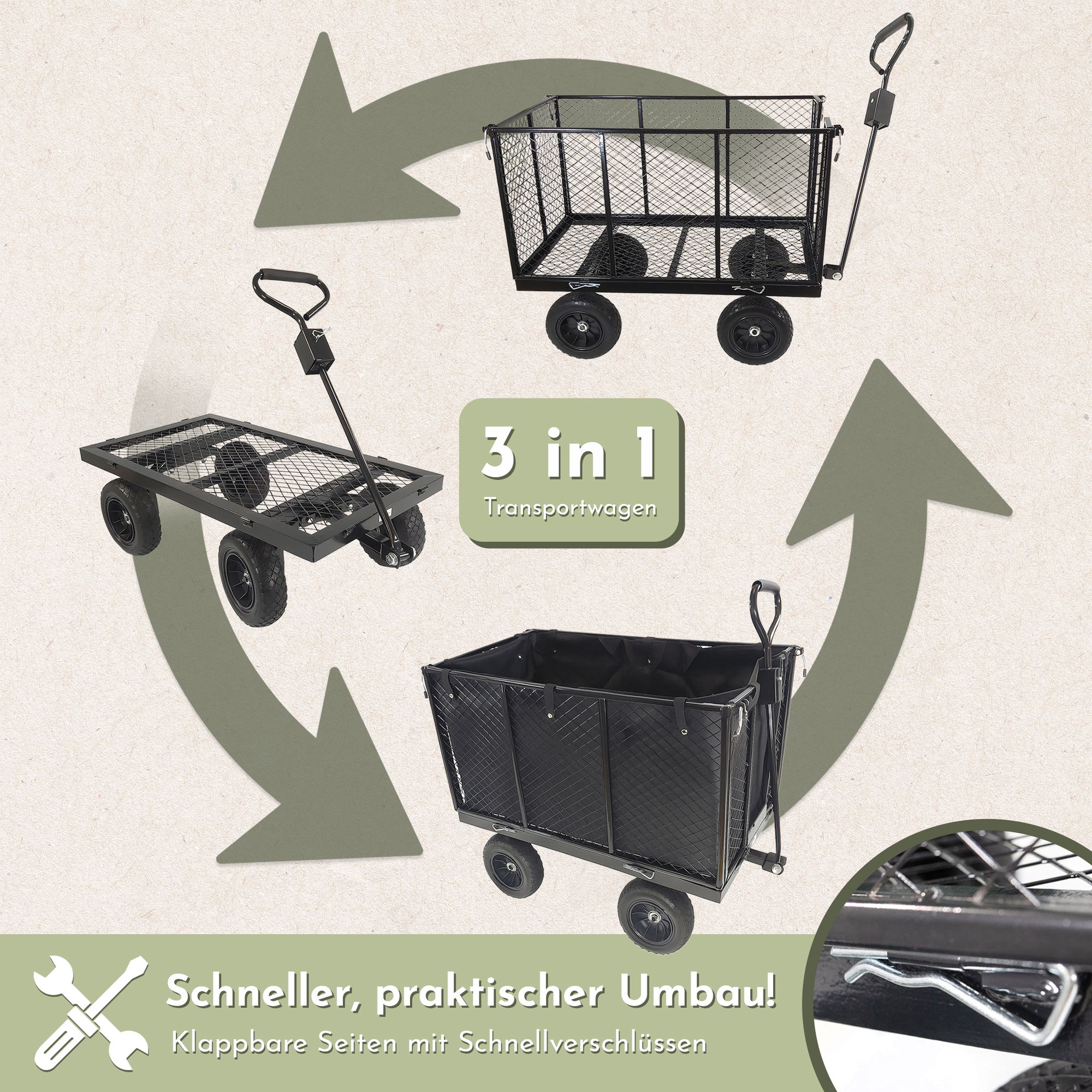 Der Wagen besteht aus einem robusten Stahlrahmen mit pulverbeschichteten Gitterflächen in Schwarz. Diese Oberfläche ist widerstandsfähig gegen Witterungseinflüsse und lässt sich leicht reinigen. Die Gitterstruktur mit Maschengrößen von etwa 44 x 28 mm im Boden und 36 x 27 mm an den Seitenteilen verbindet Stabilität mit geringem Eigengewicht. Die Einlegetasche aus beschichtetem Polyester schützt lose Materialien und Schüttgut. So kannst du auch Erde, Sand oder kleines Schnittgut transportieren, ohne dass etwas durch die Gitter fällt. Wenn du die Tasche nicht brauchst, nimmst du sie mit wenigen Handgriffen heraus und verwendest den Wagen als klassischen Gitterwagen. Vier große Gummireifen mit einem Durchmesser von etwa 25 cm tragen die Last und sorgen für ruhige Laufeigenschaften. Die Räder rollen leicht über Rasen, Kieswege oder Hofpflaster, ohne tief einzusinken oder unschöne Spuren zu hinterlassen.