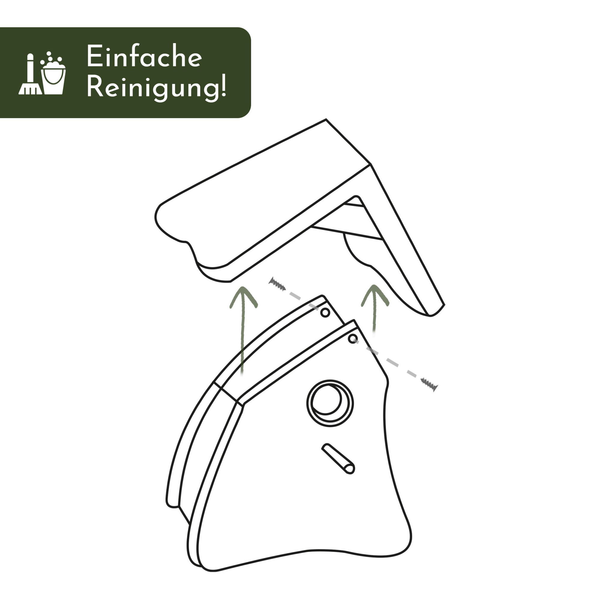 - Dach abnehmbar zum Reinigen (Schrauben vorn und hinten unter dem Dachgiebel öffnen)