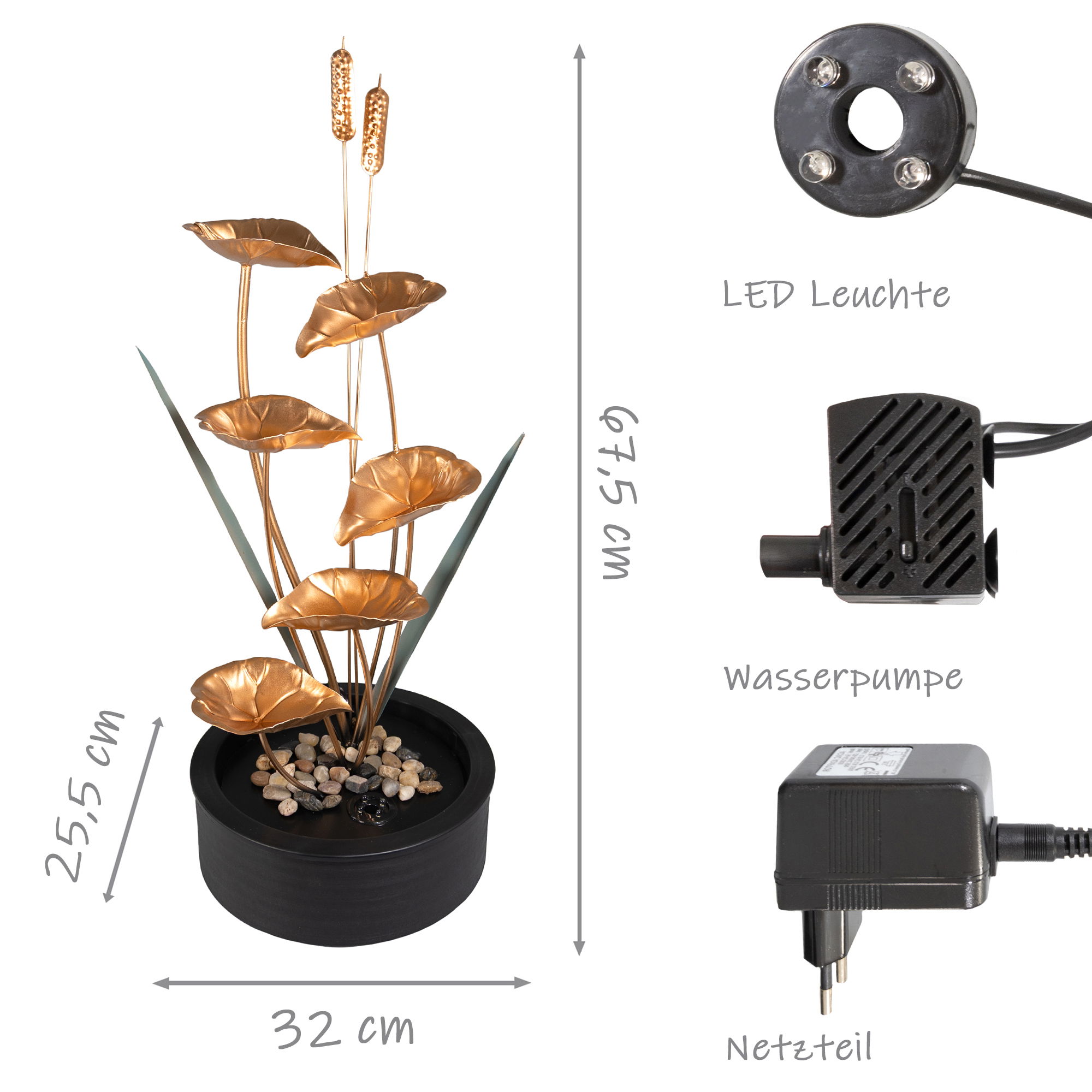 Dank seiner kompakten Maße (32×25,5×67,5 cm) passt der Tischbrunnen auf Sideboards, Beistelltische oder als Blickfang in jede Raumecke. Der widerstandsfähige Kunststoffbehälter ist pflegeleicht, die filigranen Metallblätter setzen dekorative Akzente. Die LEDs erzeugen stimmungsvolles Licht – ideal zum Meditieren, Entspannen oder als harmonische Raumdekoration. Die hochwertige, nahezu lautlose Pumpe sorgt dafür, dass nur das sanfte Plätschern des Wassers hörbar ist – kein Brummen, kein Surren.