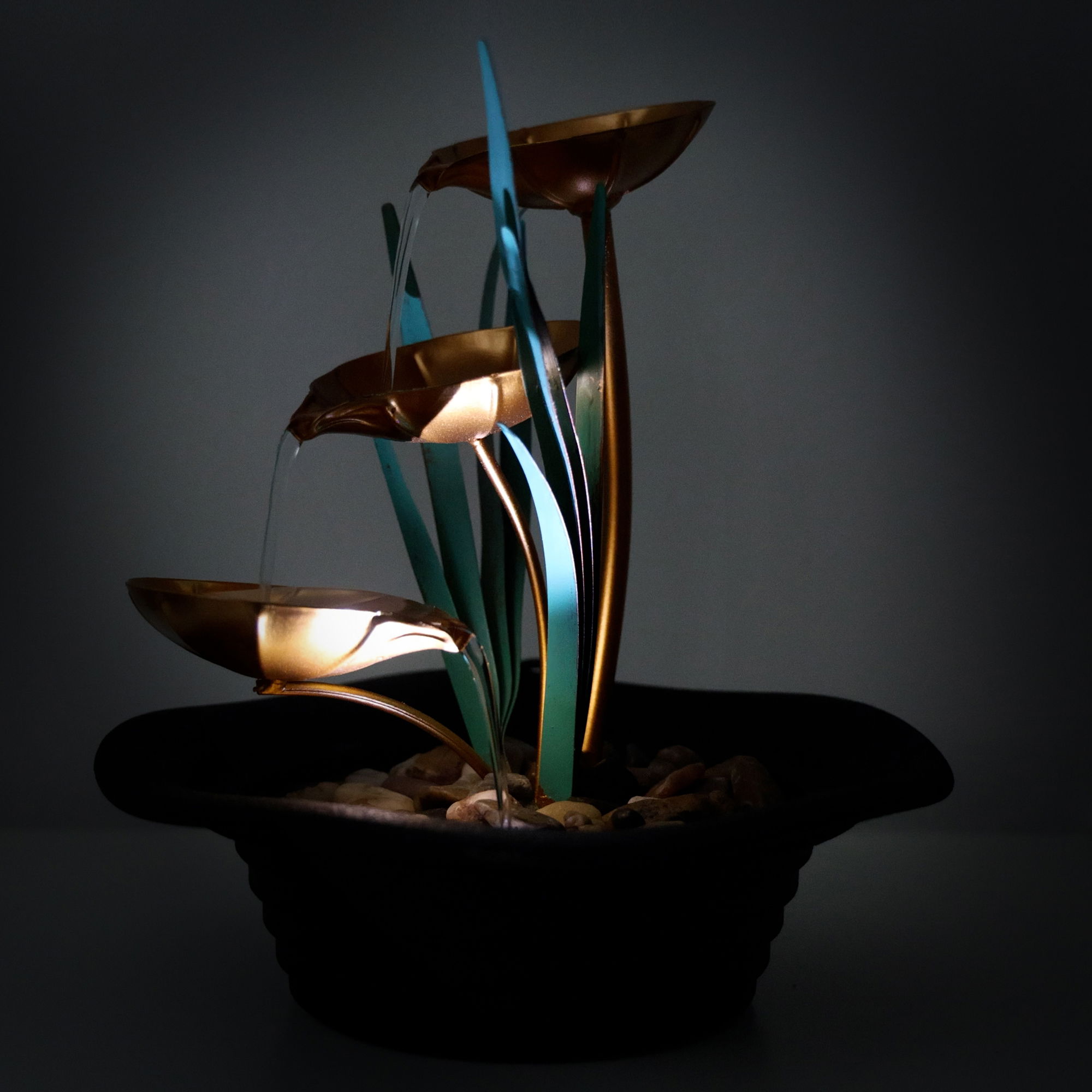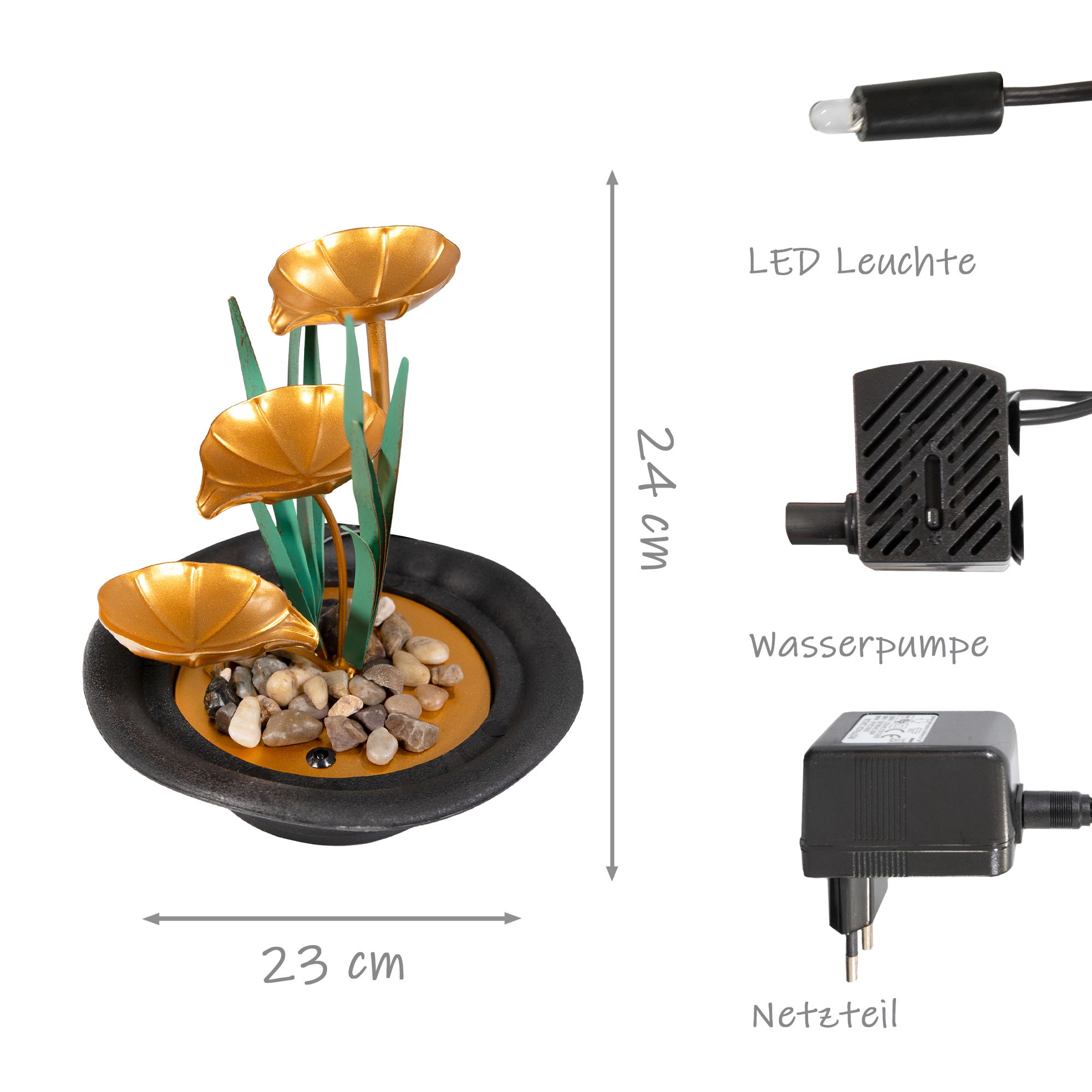 Dank seiner kompakten Maße (23x23x24 cm) passt der Tischbrunnen auf Sideboards, Beistelltische oder als Blickfang in jede Raumecke. Der widerstandsfähige Kunststoffbehälter ist pflegeleicht, die filigranen Metallblätter setzen dekorative Akzente. Die LEDs erzeugen stimmungsvolles Licht – ideal zum Meditieren, Entspannen oder als harmonische Raumdekoration. Die hochwertige, nahezu lautlose Pumpe sorgt dafür, dass nur das sanfte Plätschern des Wassers hörbar ist – kein Brummen, kein Surren.